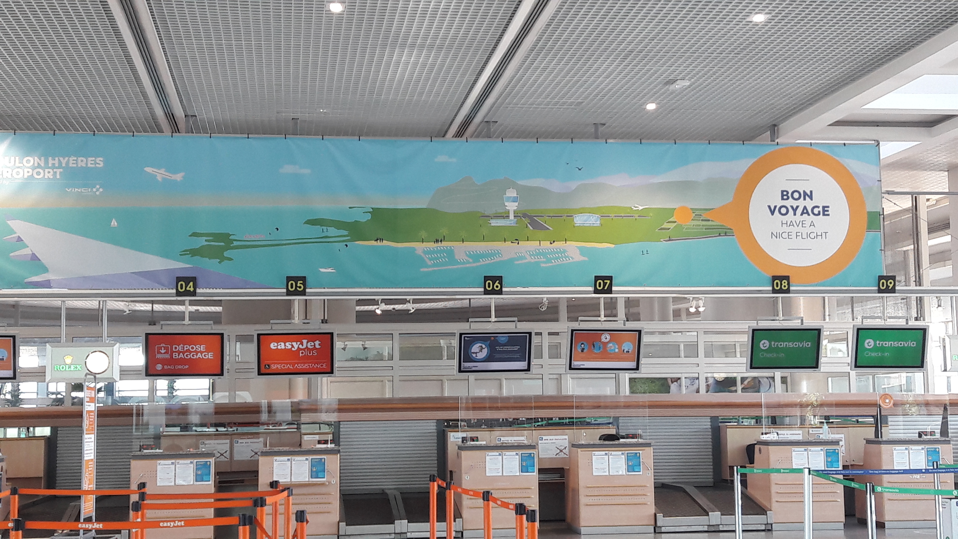 Un Avis sur la société Lowcost Transavia qui officie depuis fin Mars à la place d'Air France, c'est une vraie catastrophe, enregistrement et embarquement fait par le même personnel , fermeture 1 heure avant le décollage et vous n'avez plus personne si vous avez besoin d'un renseignement. Il faut arriver minimum 1h30 avant pour l'enregistrement, ce qui est incroyable pour un vol domestique (national). De ce fait il a fallu que mon épouse revienne me chercher pour Toulon le temps que je l'attende j'ai pris une bière avec des clients dans le même souci que moi nous avons consommé des bières et mon épouse désirait un rosé quelle surprise d'avoir comme choix un rosé de couleur orange pour finir comme choix un cellier du dauphin alors qu'ici chez nous le côtes de Provence est en première ligne côteaux de ste Anne d'Evenos le lavandou la Castille Pierrefeu du Var et j'en oublie quelle honte et le prix... Honteux pour une région de vignobles HYÈRES n'est vraiment pas à la hauteur on prend les touristes de grande majorité Parisiens souvent hommes d'affaires comme ceux que nous avons rencontré ce jour là qui un d'eux commercialisé le ste Roseline. Il est préférable de prendre le train car gain de temps et pas de mauvaises surprises sauf grève. La honte pour Toulon Hyères.