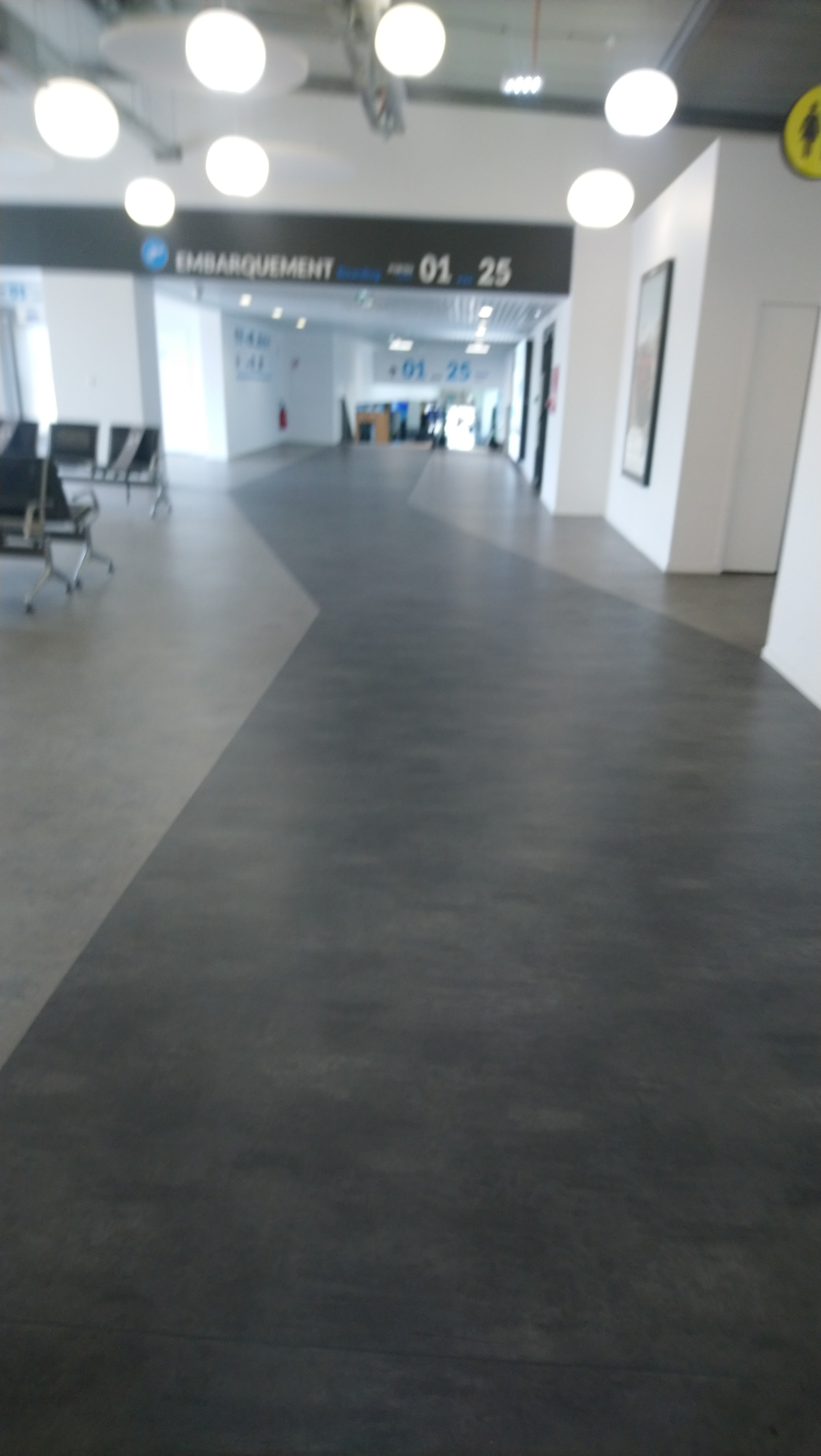 Je ne trouve pas normal, logique et très inconfortable de préparer un embarquement ou l'on fait attendre 1h de temps les personnes dans un espace sans toilette et sans fauteuil pour s'asseoir. Les 3/4 des personnes sont debout ou parterre à attendre. De tous les aéroports que j'ai fait c'est le seul comme ça. Vous pouvez améliorer facilement le bien être de vos passagers, c'est peu demander que de prévoir des sièges pour tout le monde. Surtout qu'il y'a des sièges vides à côté mais des panneaux nous empêche l'accès... Pas cool